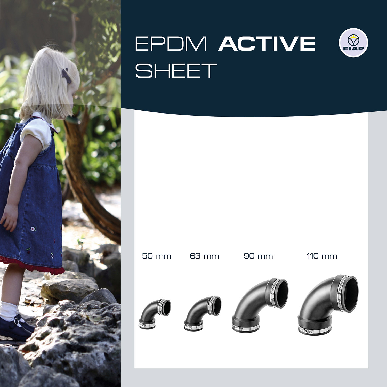 Flexibler EPDM ACTIVE Sheet - 90° Bogen aus EPDM bietet zahlreiche Vorteile bei Verbindungen zwischen Rohrleitungen. Besonders gut geeignet bei nicht oder schlecht verklebbaren Materialien wie Edelstahl, PP, PE, Beton und Polyester.