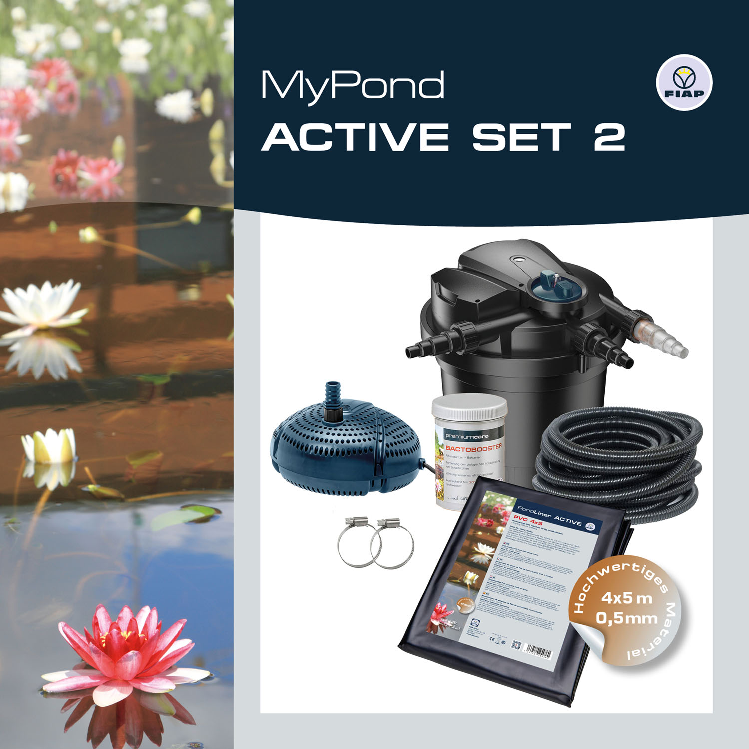 FIAP MyPond ACTIVE SET 2 - Teichkomplettset - PVC Teichfolie 4 x 5 Meter - Druckfilter POND ACTIVE 4.000 mit UVC - Teichpumpe AQUA ACTIVE Mini 2.000 - 5 Meter Spiralschlauch - Filterstarter