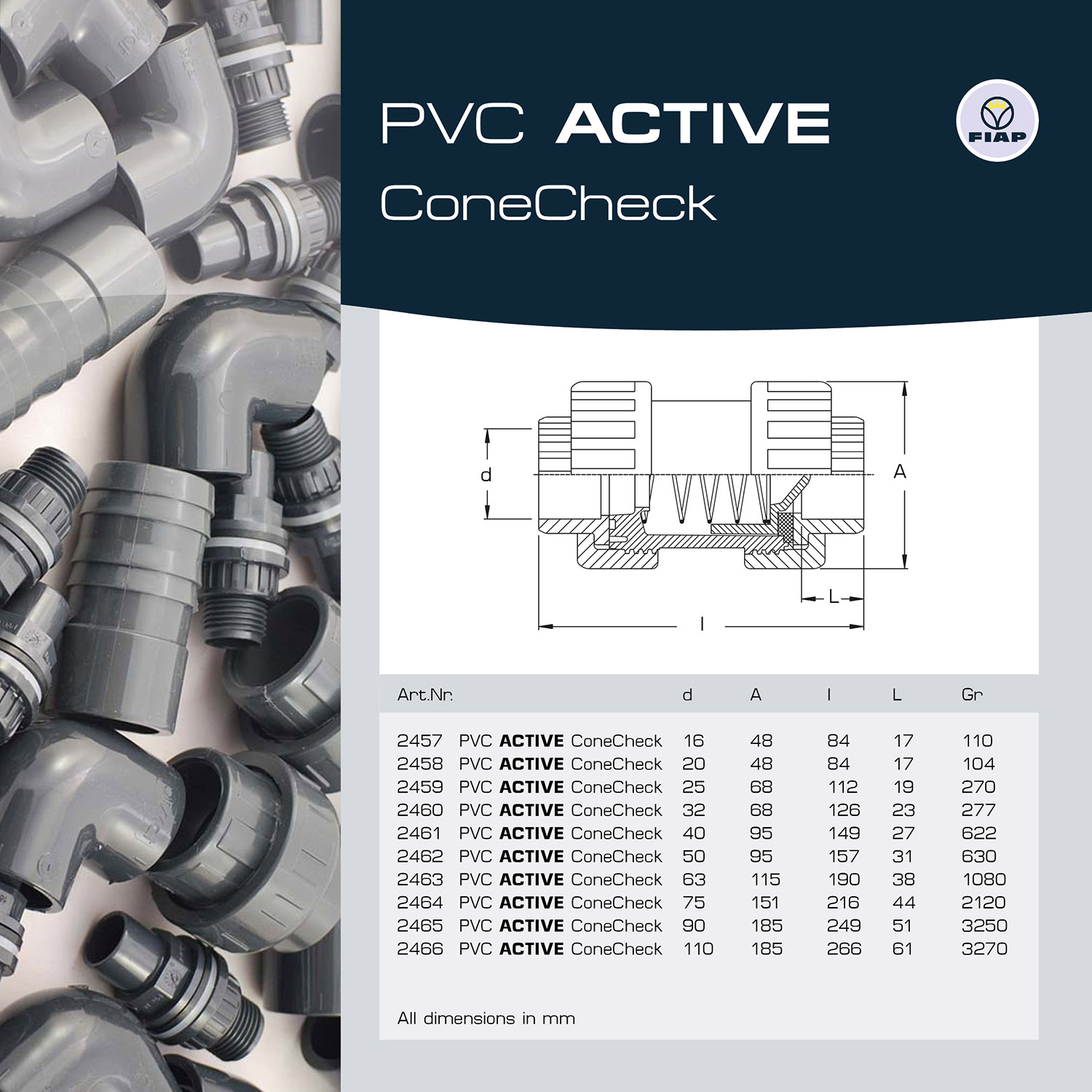 Das PVC ACTIVE ConeCheck Kegelrückschlagventil von FIAP dichtet durch den Mediumsdruck (Wassersäule). Dieses ist mit einer Feder ausgerüstet, schließt selbstständig und lässt sich lageunabhängig einbauen. Der Haupteinsatzbereich der Rückschlagventile ist die Rückflussverhinderung: Sie schützen Pumpen in Rohrleitungen. Sehr hochwertige Ausführung für lange Betriebsdauer und Funktionalität.