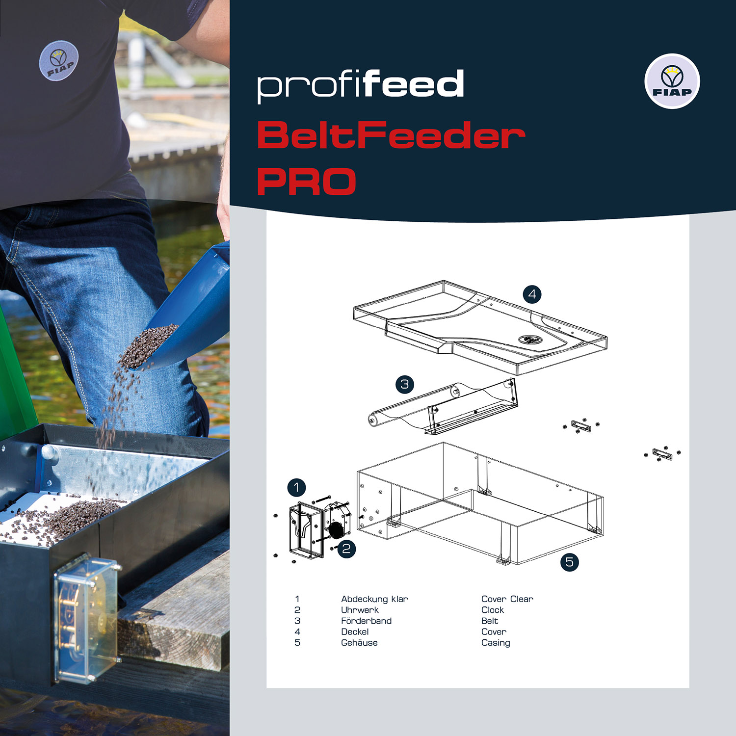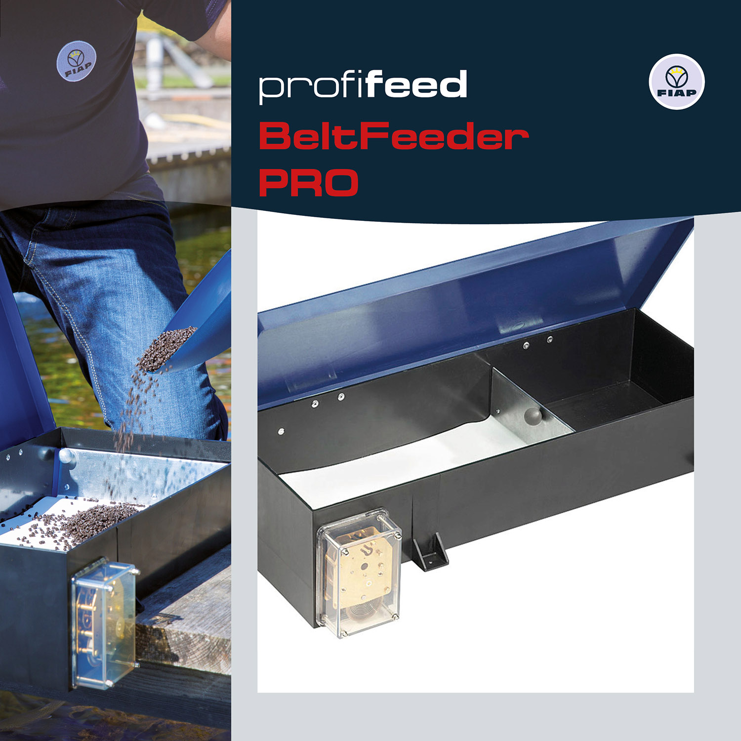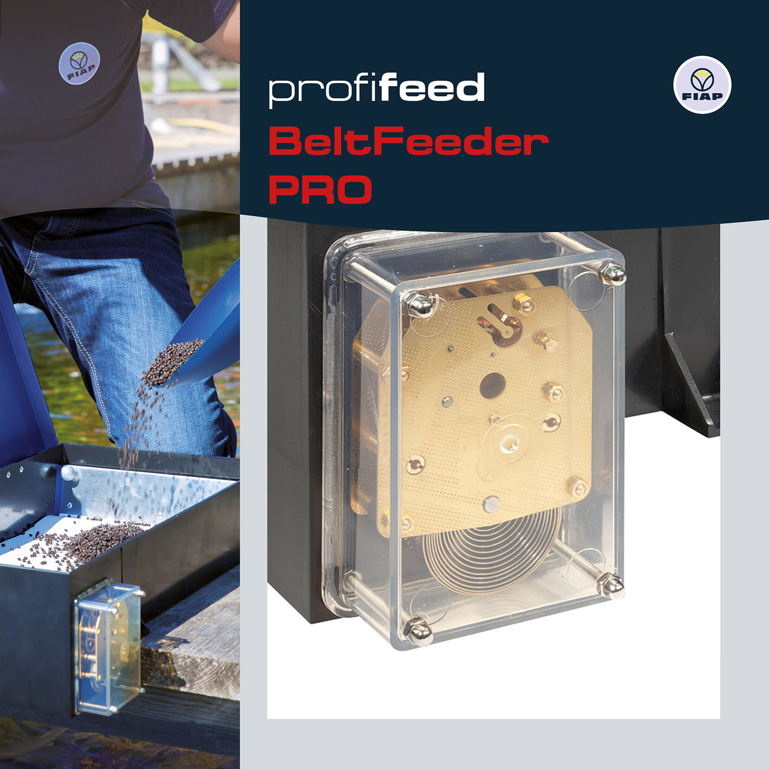 Als innovatives Unternehmen haben wir den profifeed BeltFeeder weiterentwickelt und bieten Ihnen nun unser neues Modell den profifeed BeltFeeder PRO. Der profifeed BeltFeeder PRO von FIAP ist in zwei Größen (Fassungsvermögen 3 kg und 5 kg) und mit drei verschiedenen Uhrwerklaufzeiten (4 Std., 12 Std. und 24 Std.) lieferbar. Die absolute Neuheit des profifeed BeltFeeder PRO ist die aus seewasserbeständigem Aluminium gefertigte Antriebswelle mit integriertem Förderband.