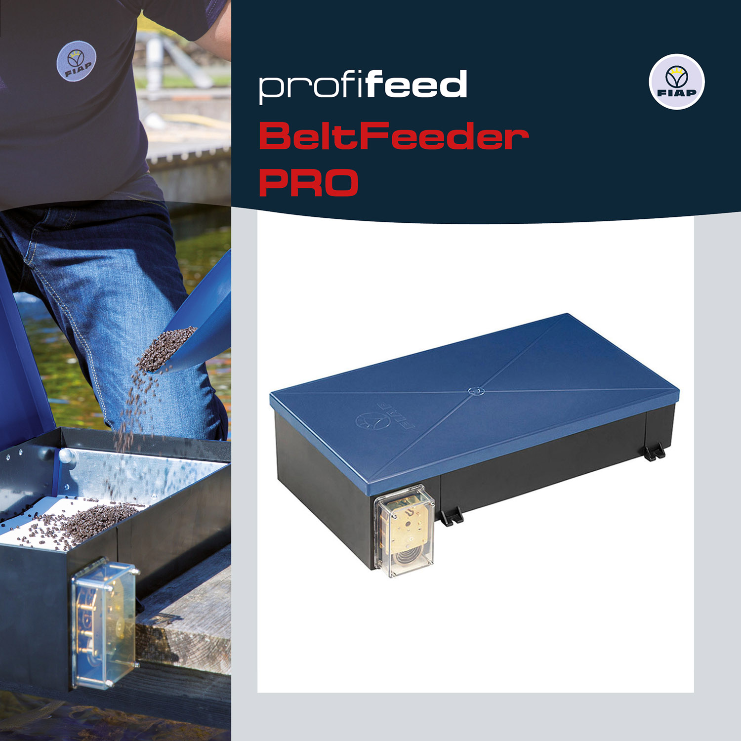 Als innovatives Unternehmen haben wir den profifeed BeltFeeder weiterentwickelt und bieten Ihnen nun unser neues Modell den profifeed BeltFeeder PRO. Der profifeed BeltFeeder PRO von FIAP ist in zwei Größen (Fassungsvermögen 3 kg und 5 kg) und mit drei verschiedenen Uhrwerklaufzeiten (4 Std., 12 Std. und 24 Std.) lieferbar. Die absolute Neuheit des profifeed BeltFeeder PRO ist die aus seewasserbeständigem Aluminium gefertigte Antriebswelle mit integriertem Förderband.