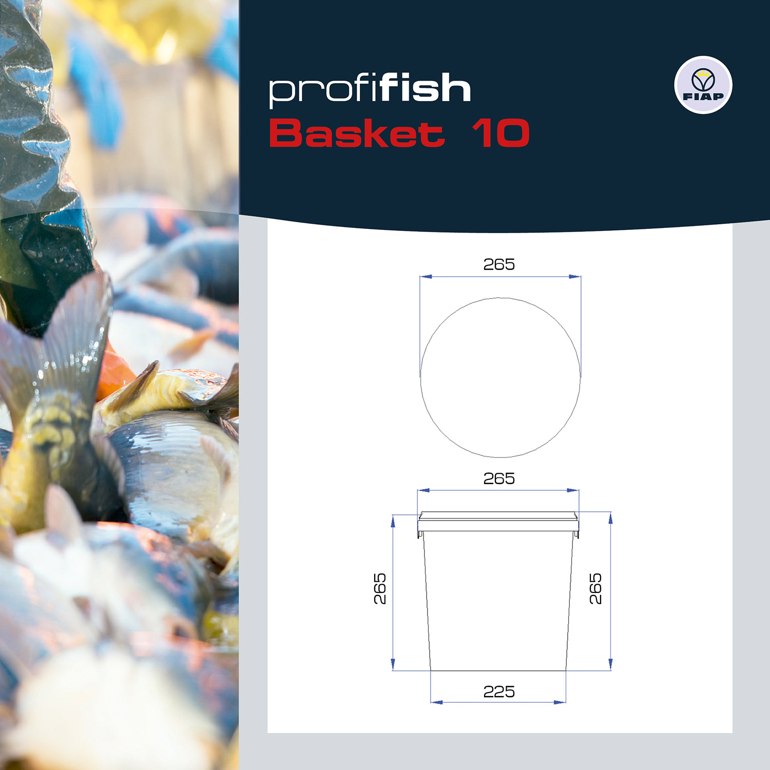 Der profifish Basket 10 - Eimer aus Kunststoff PP von FIAP hat eine Abmessung von oben Ø 265 x unten Ø 225 x 265 mm und ein Volumen von 10,7 Liter Inhalt.