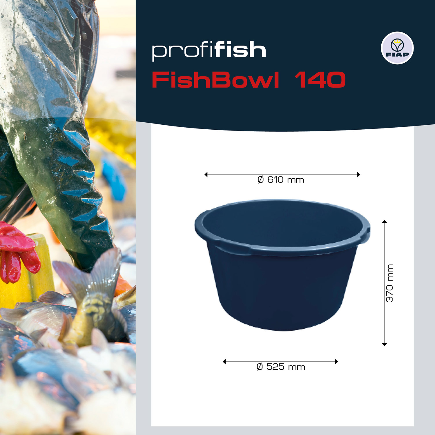 Der profifish FishBowl 140 - Behälter aus Kunststoff PE von FIAP hat eine Abmessung von oben Ø 670 x 400 mm und ein Volumen von 140 Liter Inhalt.