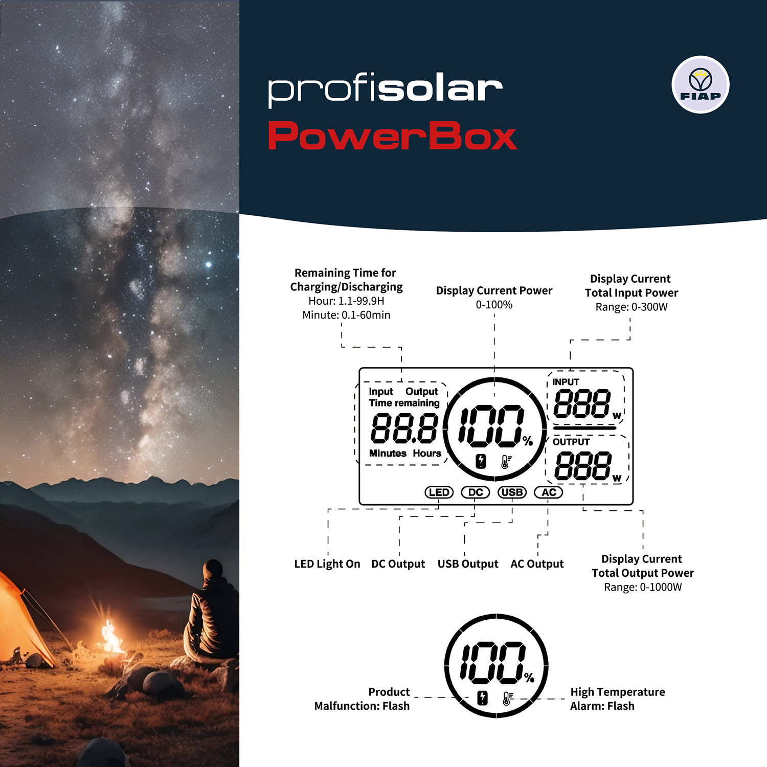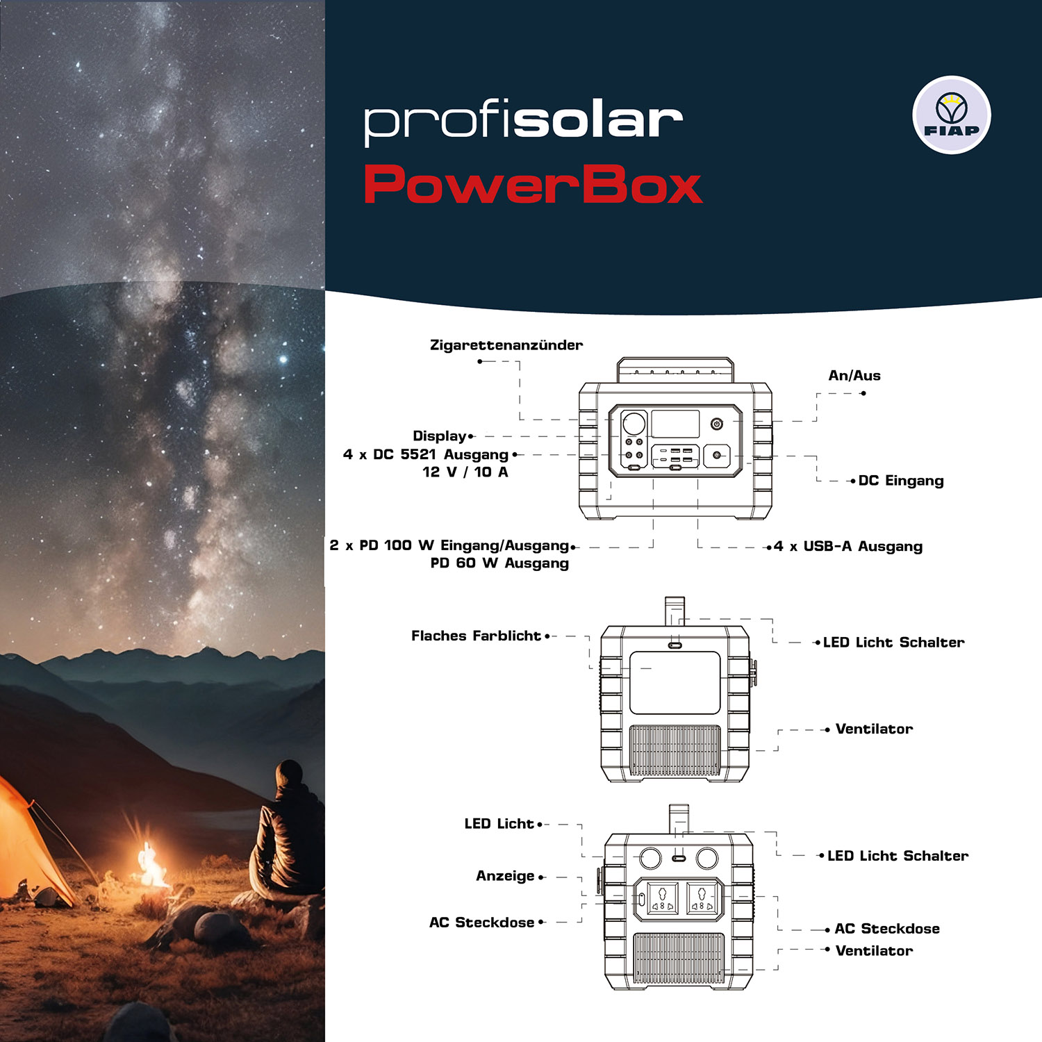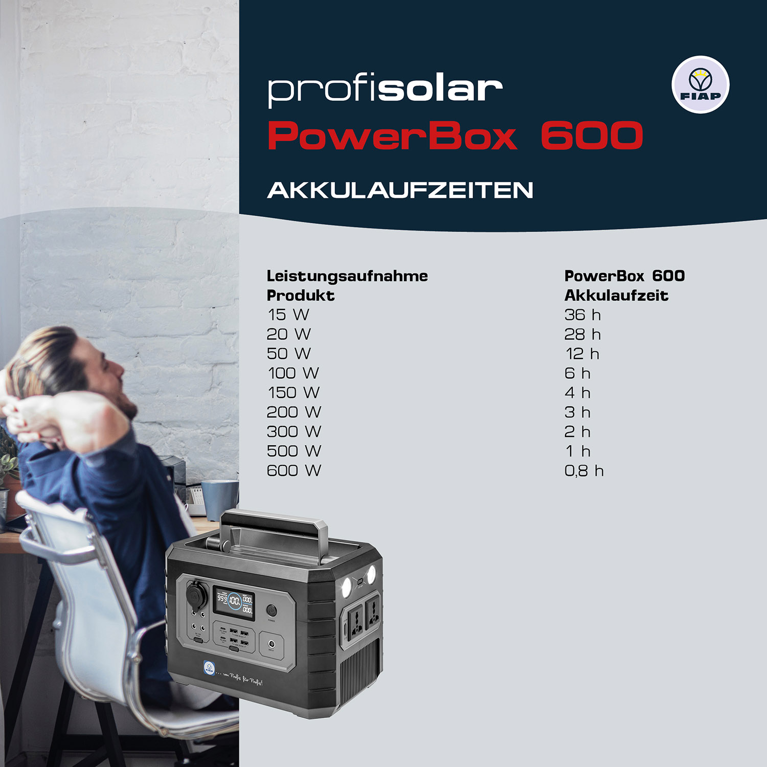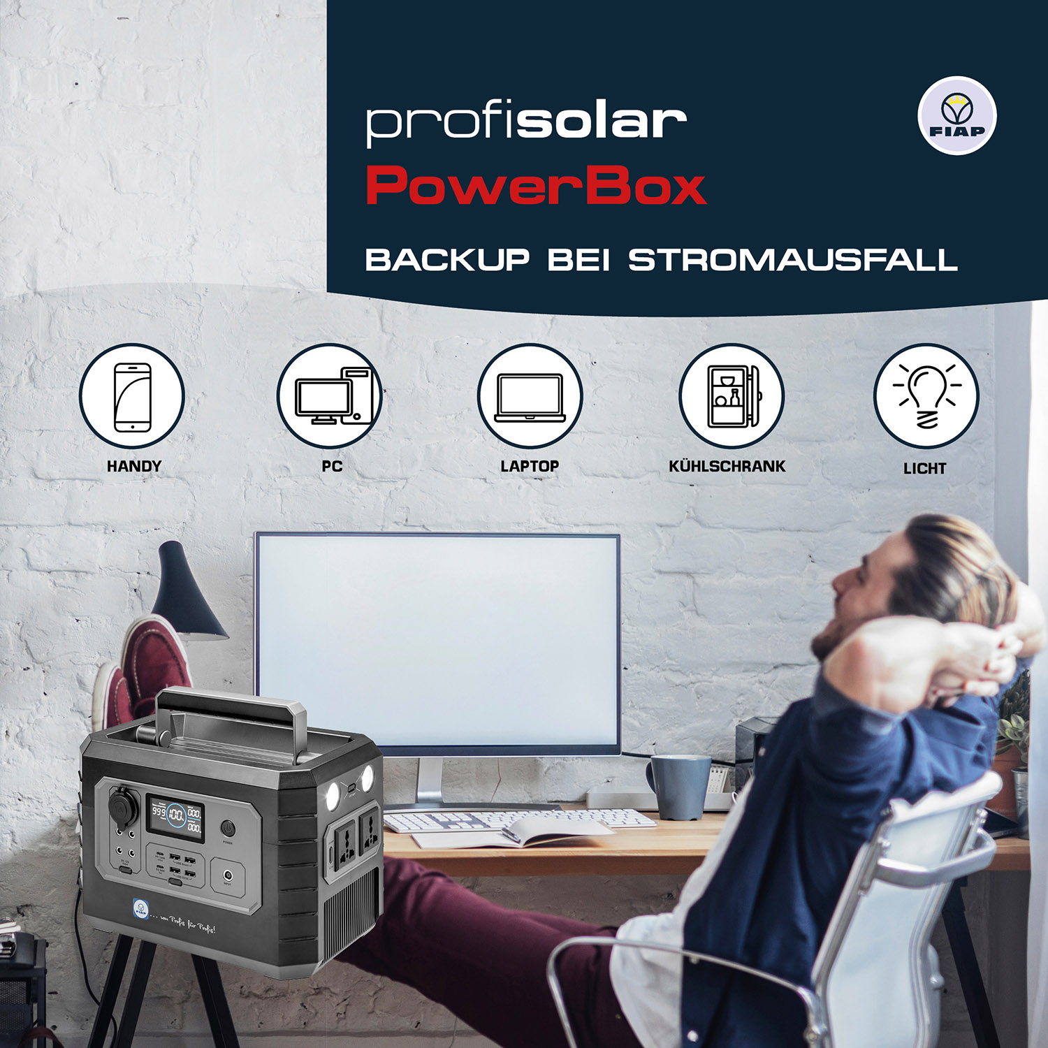 FIAP profisolar PowerBox 600 - tragbare, mobile Powerstation inklusive 100 W Solarpanel - 537 Wh LiFePO4 Batterie-Backup mit 2 600 W AC Ausgängen (1.200W Peak) - mobile Stromversorgung für Reise, Camping, Outdoor