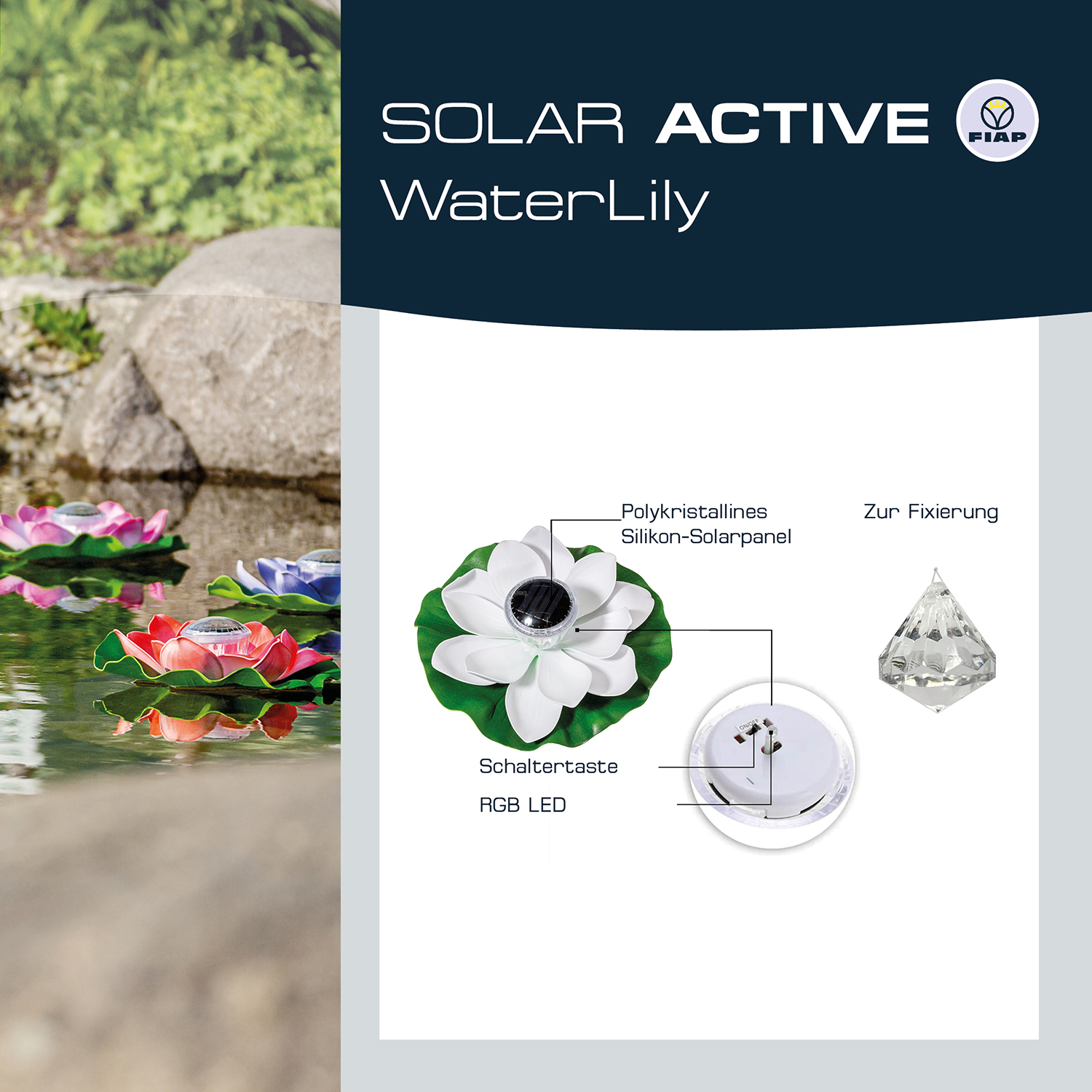 FIAP SOLAR ACTIVE WaterLily 5 SET - schwimmende Seerosen - Solarbeleuchtung - LED - inklusive Akkubatterie AAA 1,2 V - Teichbeleuchtung - IP65 - Farbe weiß, gelb, pink, lila, rot - Abmessung Ø 280 x 80 mm - Gartenteich - Pool