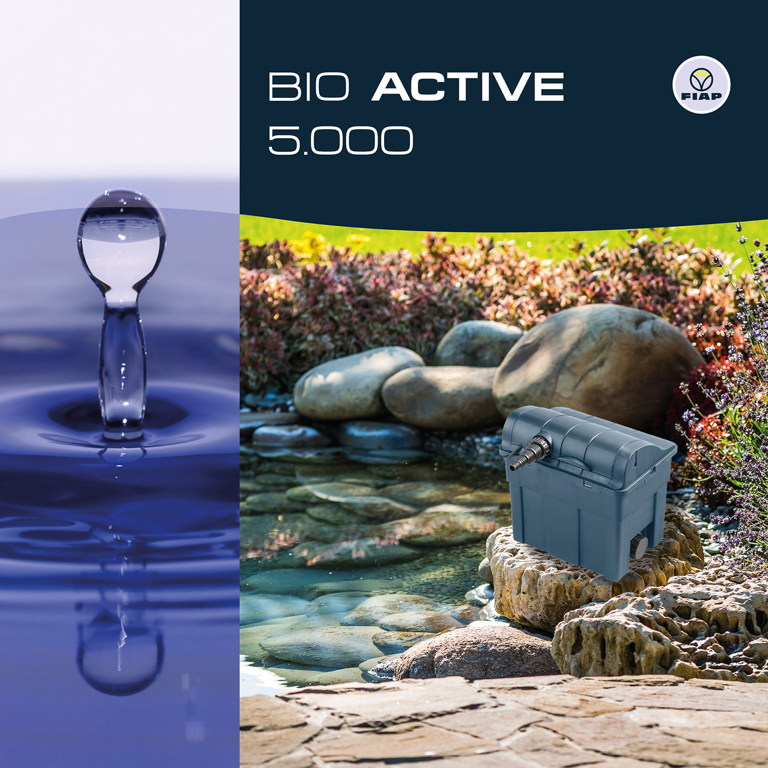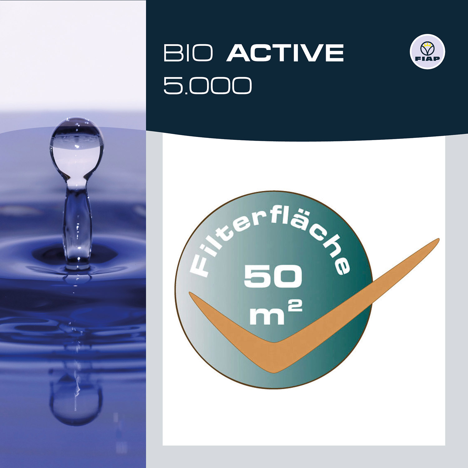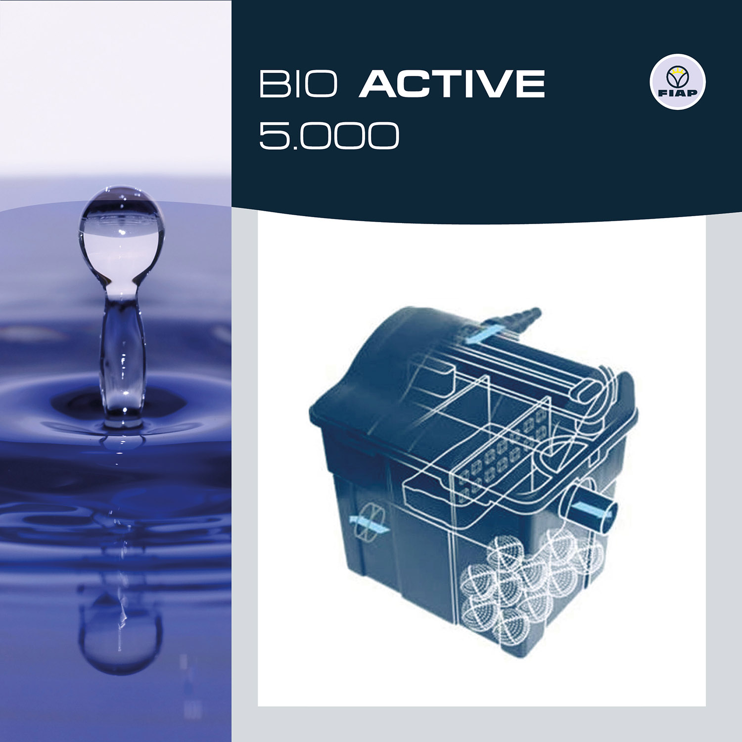 Der FIAP BIO ACTIVE 5.000 ist ein hochwirksames Komplettsystem zur Reinigung des Teichwassers. Der besondere Effekt: Anreicherung des gefilterten Wassers mit zusätzlichem Sauerstoff. Diese Komponente bietet dem Privatanwender eine hoch professionelle Technologie. Es entsteht ein perfektes Zusammenspiel bewährter und neuartiger Filtertechnik. Diese Serie ist zudem besonders wartungsfreundlich. Das Wasser durchfließt Kammern mit verschiedenen Filtermedien und wird zusätzlich durch ein leistungsstarkes UVC Gerät gereinigt. Die UVC Strahlung reduziert die Algenbildung. Ergänzt wird das Mehrkammersystem durch das speziell konzipierte UP-FLOW Prinzip. Das vorgefilterte Wasser wird dabei über eine Abrisskante geführt und stark mit Umgebungsluft angereichert. Dadurch erfolgt die zielgerichtete Zuführung von Sauerstoff, welcher zu den Grundvoraussetzungen für gesundes Teichwasser und ein intaktes biologisches Gleichgewicht zählt. Dieses Kombination beider Techniken bewirkt eine Teichfilterung auf hohem Niveau und sorgt nachhaltig und sehr effizient für gesundes Wasser im Teich. Das Filtersystem mit hohem Bedienkomfort.