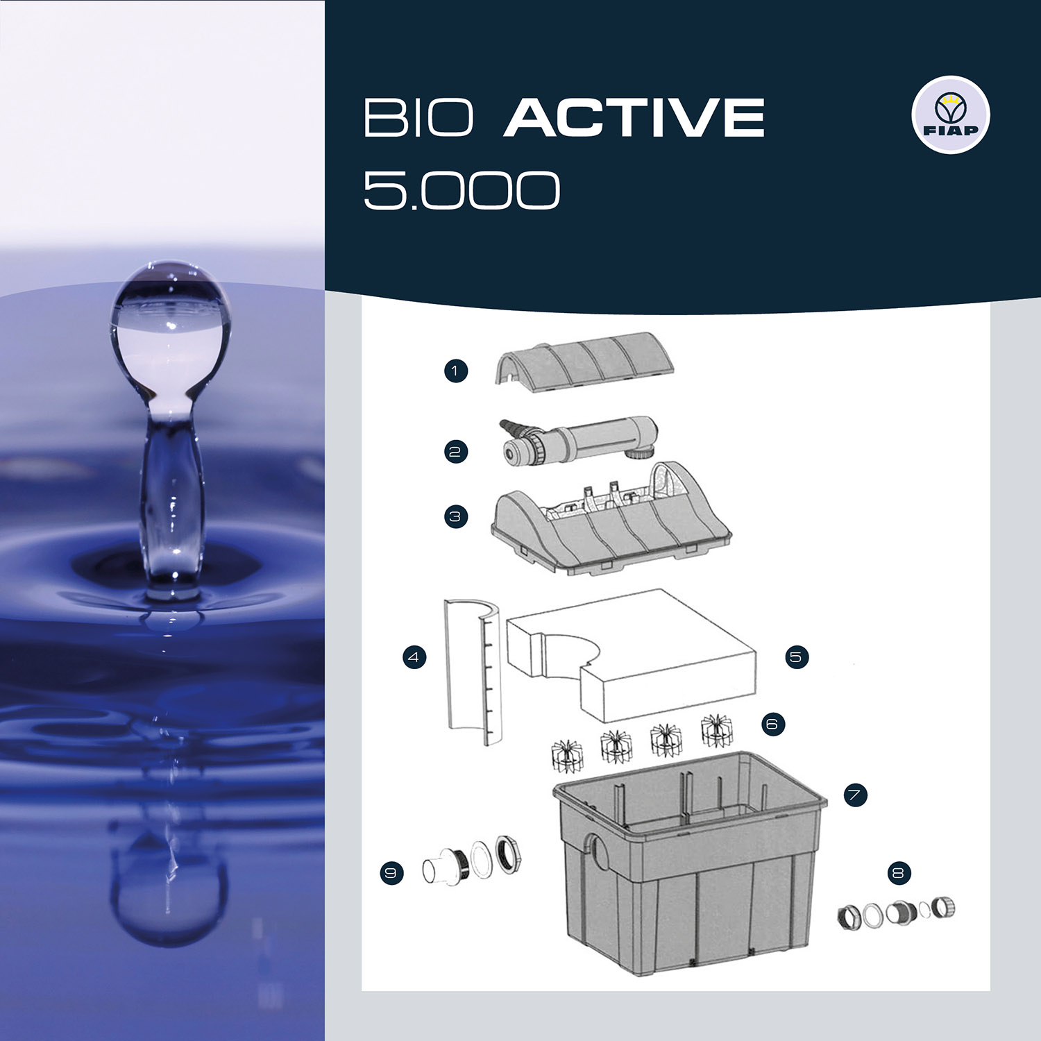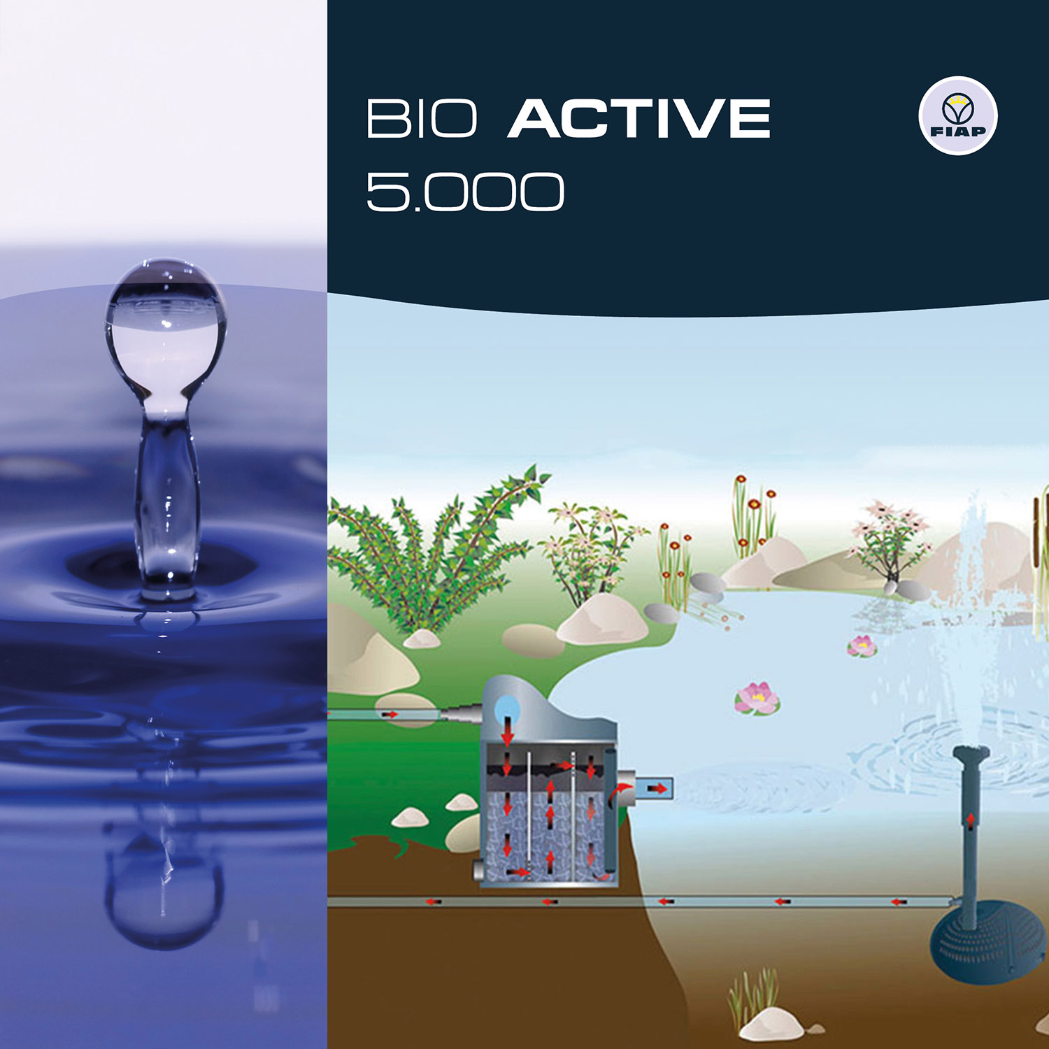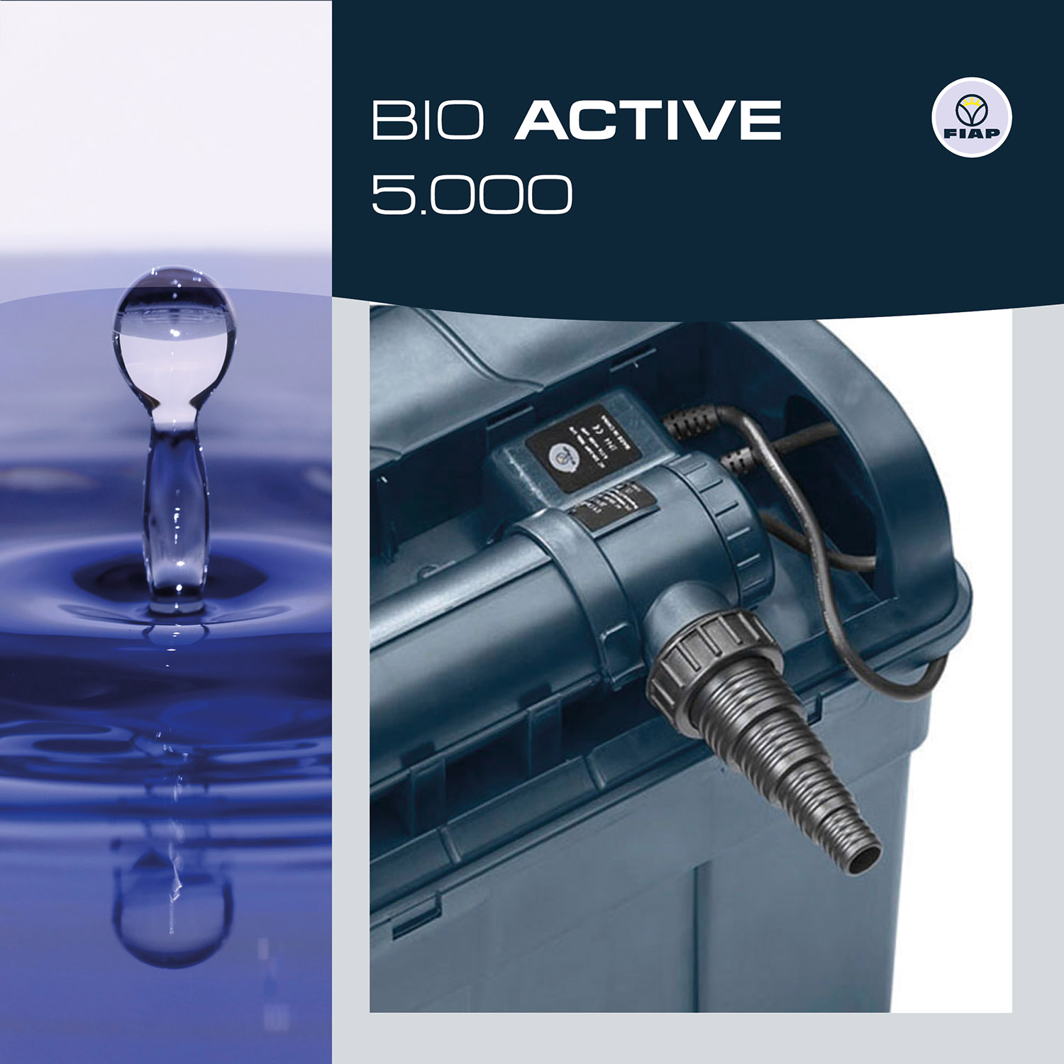 Der FIAP BIO ACTIVE 5.000 ist ein hochwirksames Komplettsystem zur Reinigung des Teichwassers. Der besondere Effekt: Anreicherung des gefilterten Wassers mit zusätzlichem Sauerstoff. Diese Komponente bietet dem Privatanwender eine hoch professionelle Technologie. Es entsteht ein perfektes Zusammenspiel bewährter und neuartiger Filtertechnik. Diese Serie ist zudem besonders wartungsfreundlich. Das Wasser durchfließt Kammern mit verschiedenen Filtermedien und wird zusätzlich durch ein leistungsstarkes UVC Gerät gereinigt. Die UVC Strahlung reduziert die Algenbildung. Ergänzt wird das Mehrkammersystem durch das speziell konzipierte UP-FLOW Prinzip. Das vorgefilterte Wasser wird dabei über eine Abrisskante geführt und stark mit Umgebungsluft angereichert. Dadurch erfolgt die zielgerichtete Zuführung von Sauerstoff, welcher zu den Grundvoraussetzungen für gesundes Teichwasser und ein intaktes biologisches Gleichgewicht zählt. Dieses Kombination beider Techniken bewirkt eine Teichfilterung auf hohem Niveau und sorgt nachhaltig und sehr effizient für gesundes Wasser im Teich. Das Filtersystem mit hohem Bedienkomfort.