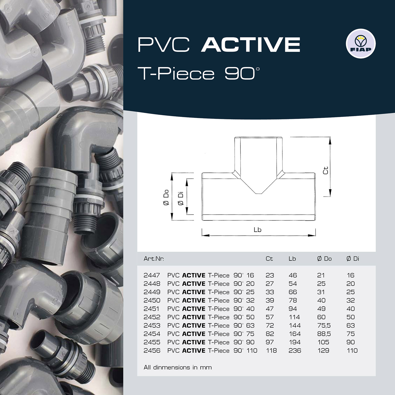 Das PVC ACTIVE T-Piece 90° (T - Stück 90°) von FIAP wird dazu verwendet, um PVC Rohrleitungen aufzuteilen bzw. eine zusätzliche Abzweigung zu schaffen. Es können auch 2 Rohrleitungen zu einer zusammengeführt werden, um den Druck in einer Rohrleitung zu erhöhen. Das PVC ACTIVE T-Piece 90° (T - Stück 90°) von FIAP ist für einen maximalen Druck von 10 bar ausgelegt.
