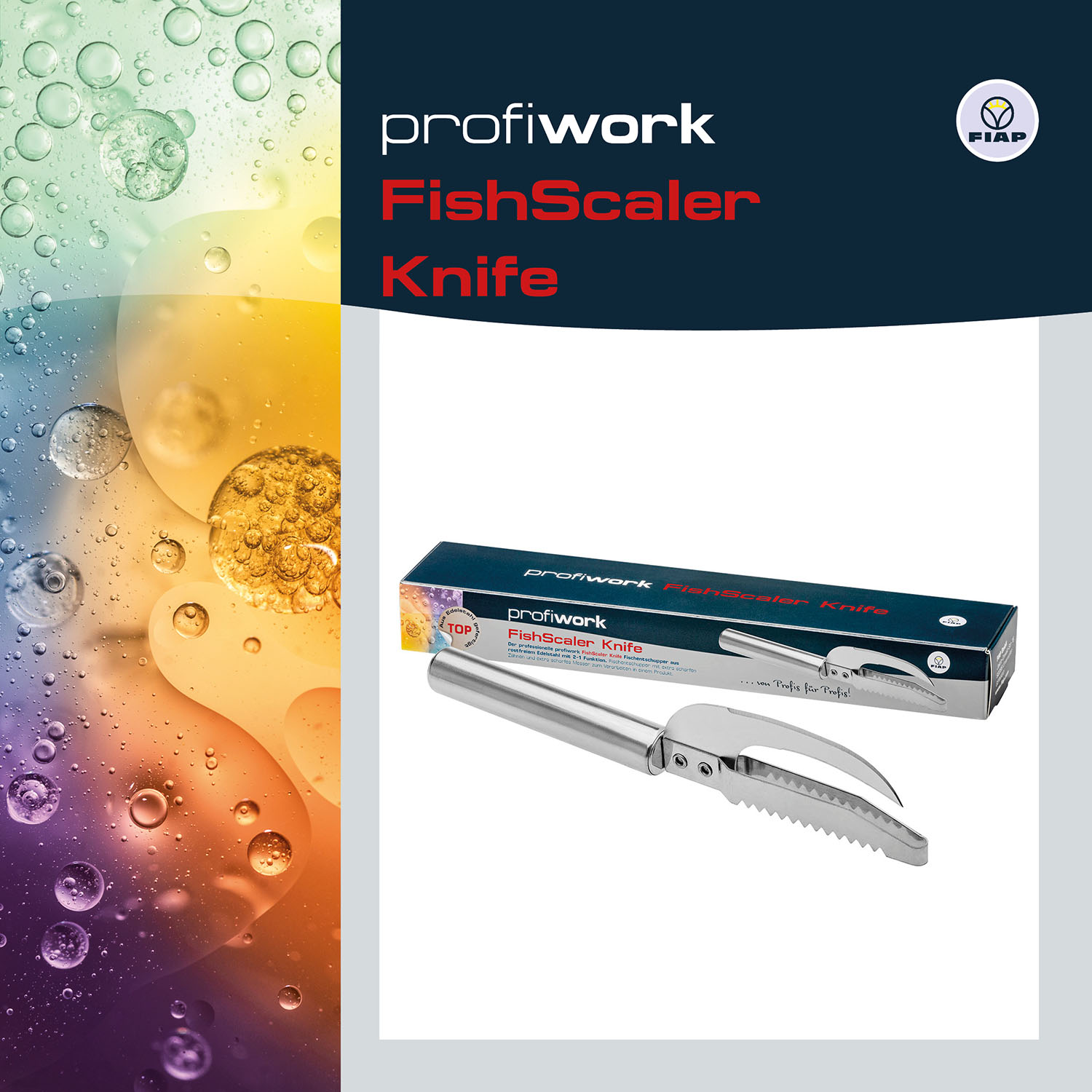 Der multifunktionale profiwork FishScaler Knife von FIAP aus rostfreiem Edelstahl eignet sich zum Entschuppen, Auf- bzw. Einschneiden und Ausnehmen fast aller Schuppenfische wie Lachs, Barsch, Sardinen etc..